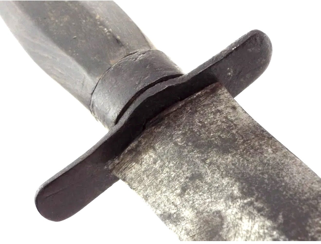 Old fighting knife with brass guard and butt cap. Measures 12-3/4” overall and 8” blade. $625