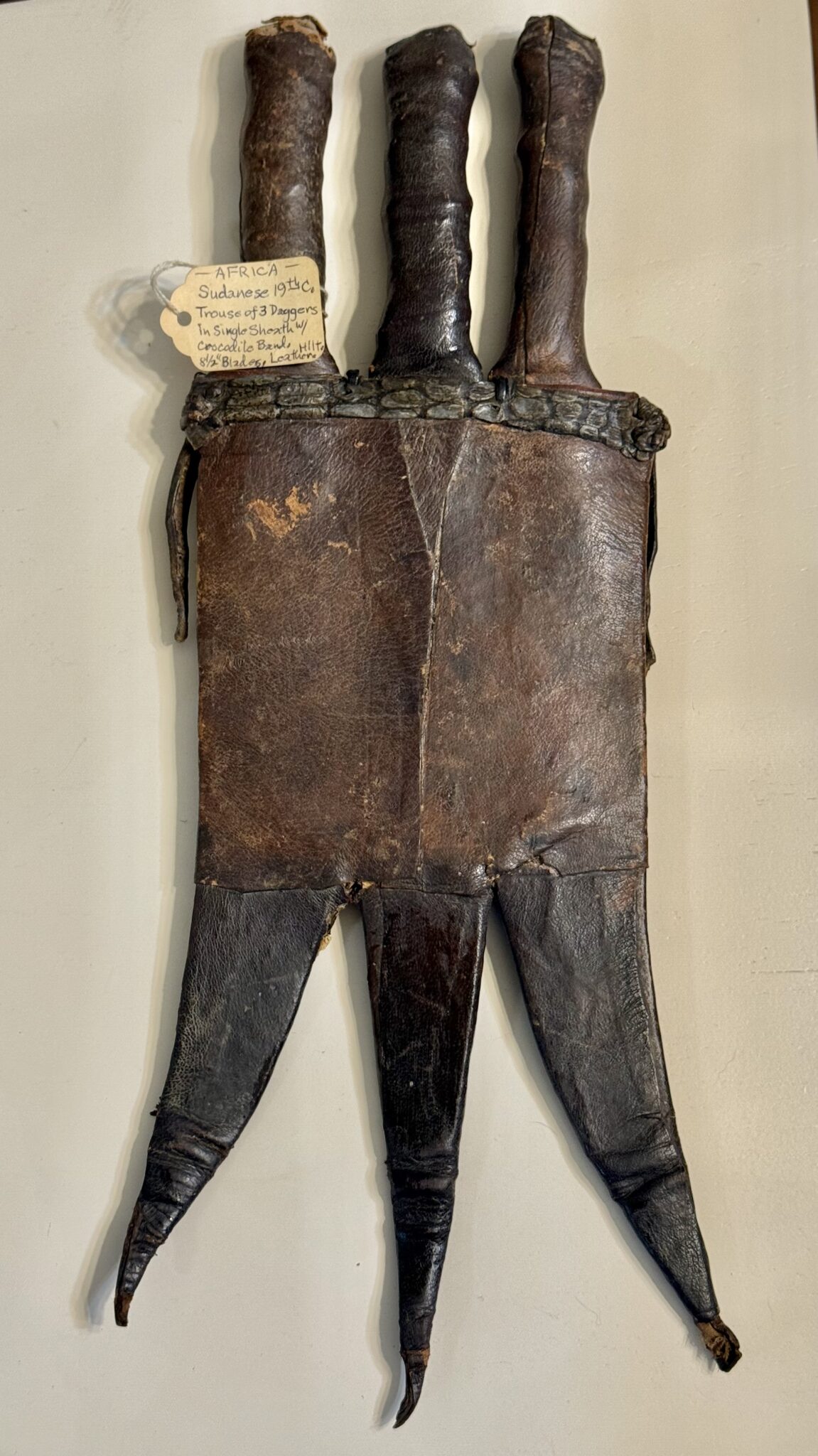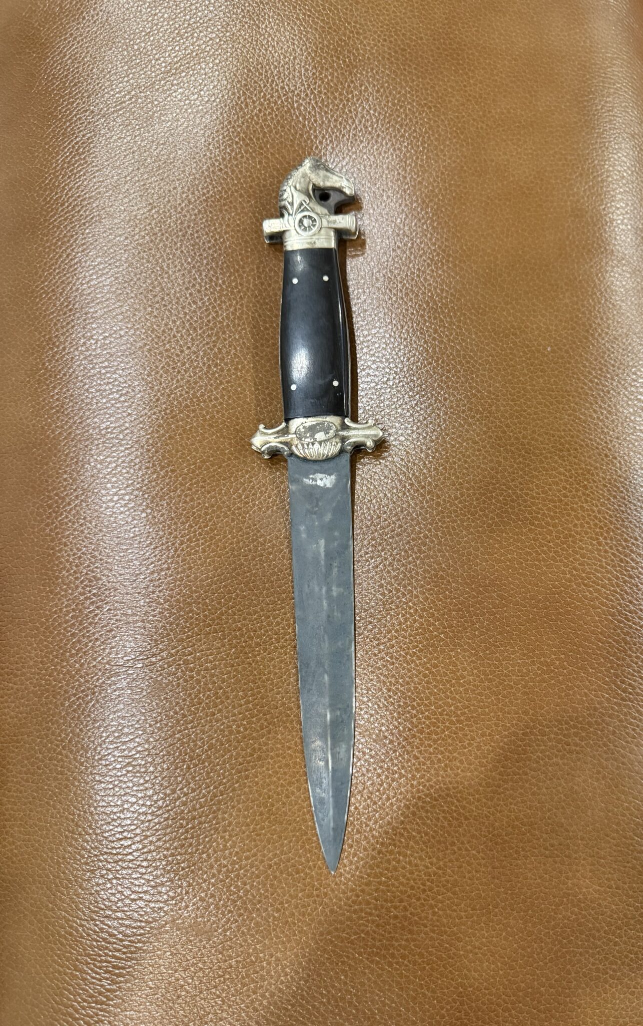 With blued 6.25” double edged blade, oval guard ring turned cast steel grip and cap stand rivet, total length 11” with original brown leather sheath with brass drag.” Total length 14”. $925