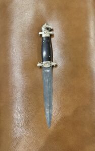 With 5.5” double edged unmarked steel blade, cast brass bar type guard, and crown pommel with steel capstan rivet and front and rear collars on cordage wrapped wood grip, total length 10.5, with original black leather sheath with embroidered initial on front “R”. $1475