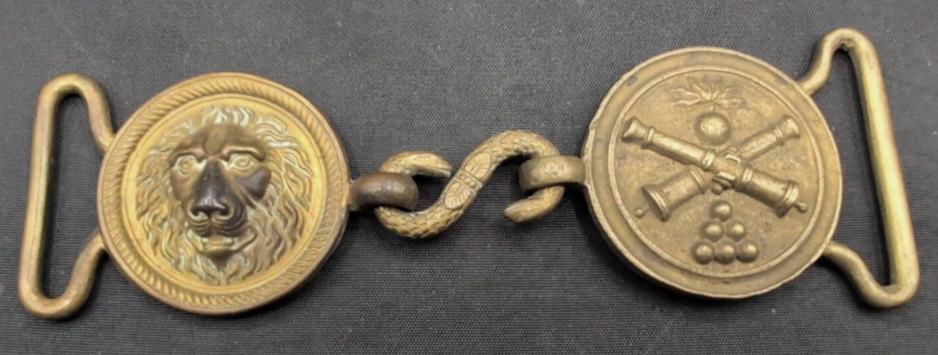 Civil War Confederate Lions head belt buckle with snake connector. Other part has cannon balls, cross cannons and ordnance bomb. Most likely this buckle was made by Robert Mole of England and shipped to the south. $2495