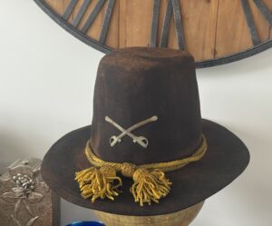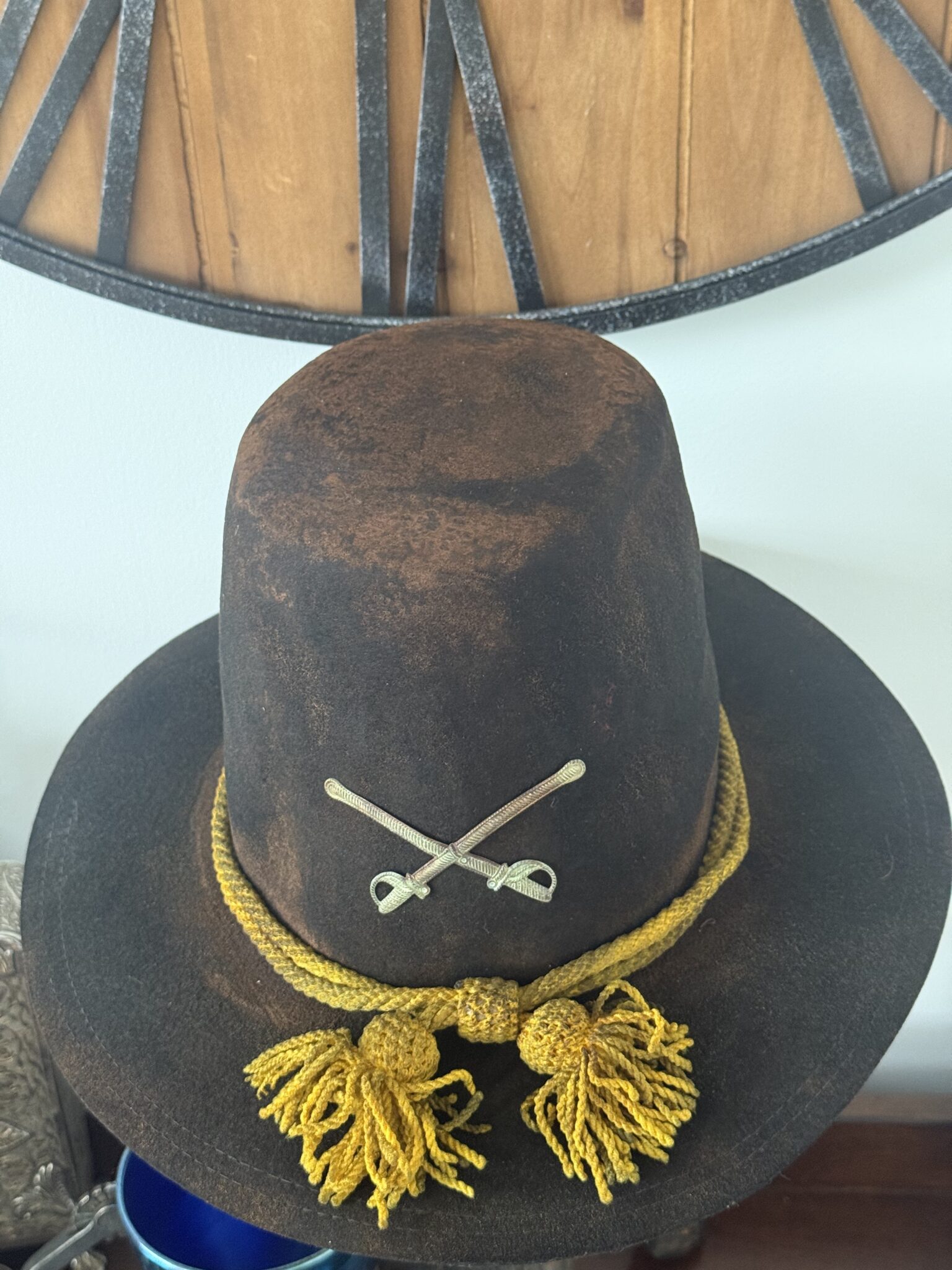 Civil War cavalry officer slouch hat with yellow cord and crossed swords insignia. Hat is in fine battlefield condition with a tall brim. Makes for a nice display. $3550