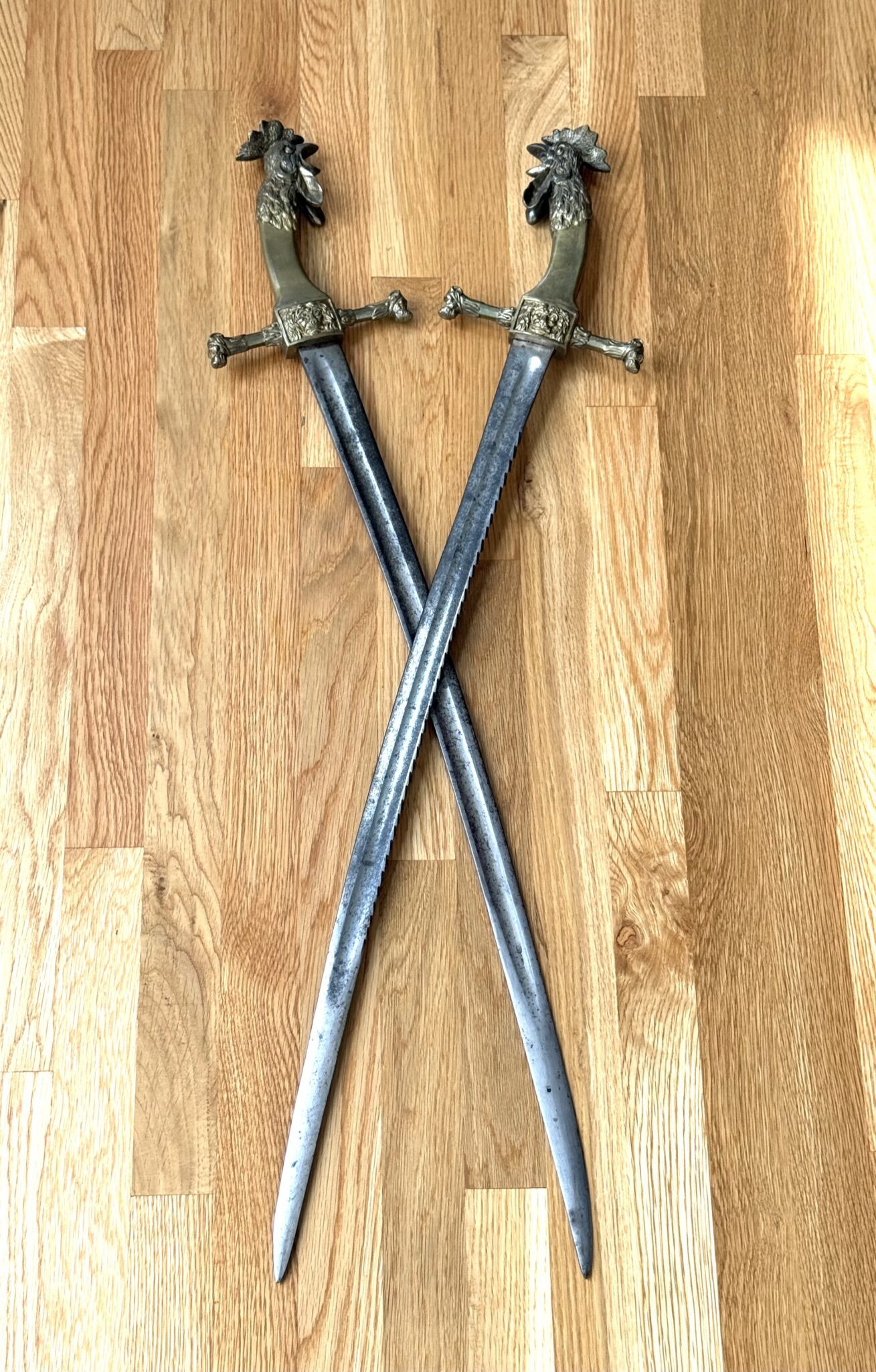 PAIR-1700’s ROOSTER HEAD SWORDS.One of the old swords has a sawback spine and the other sword has a smooth spin. They measure 37 inches with blade at 29 inches. These swords would make a nice display. POR |