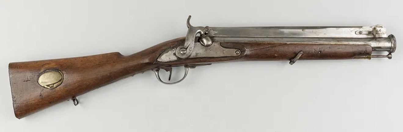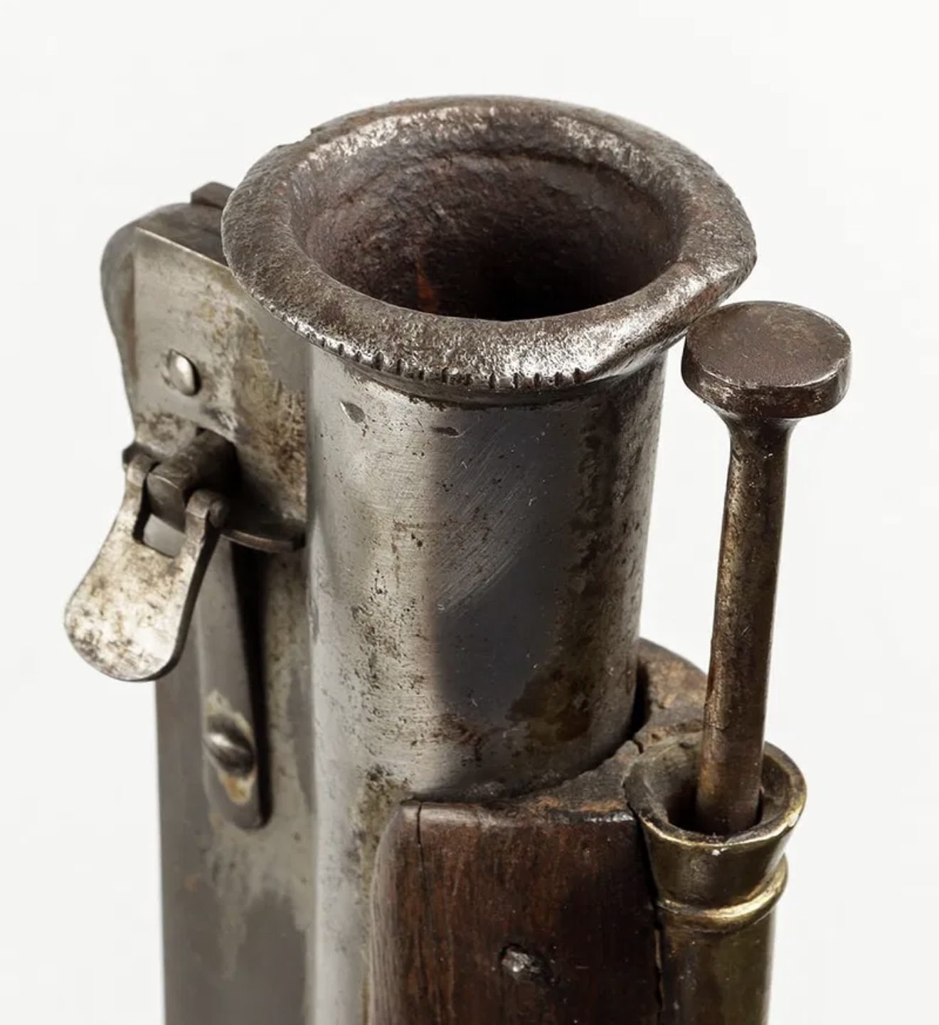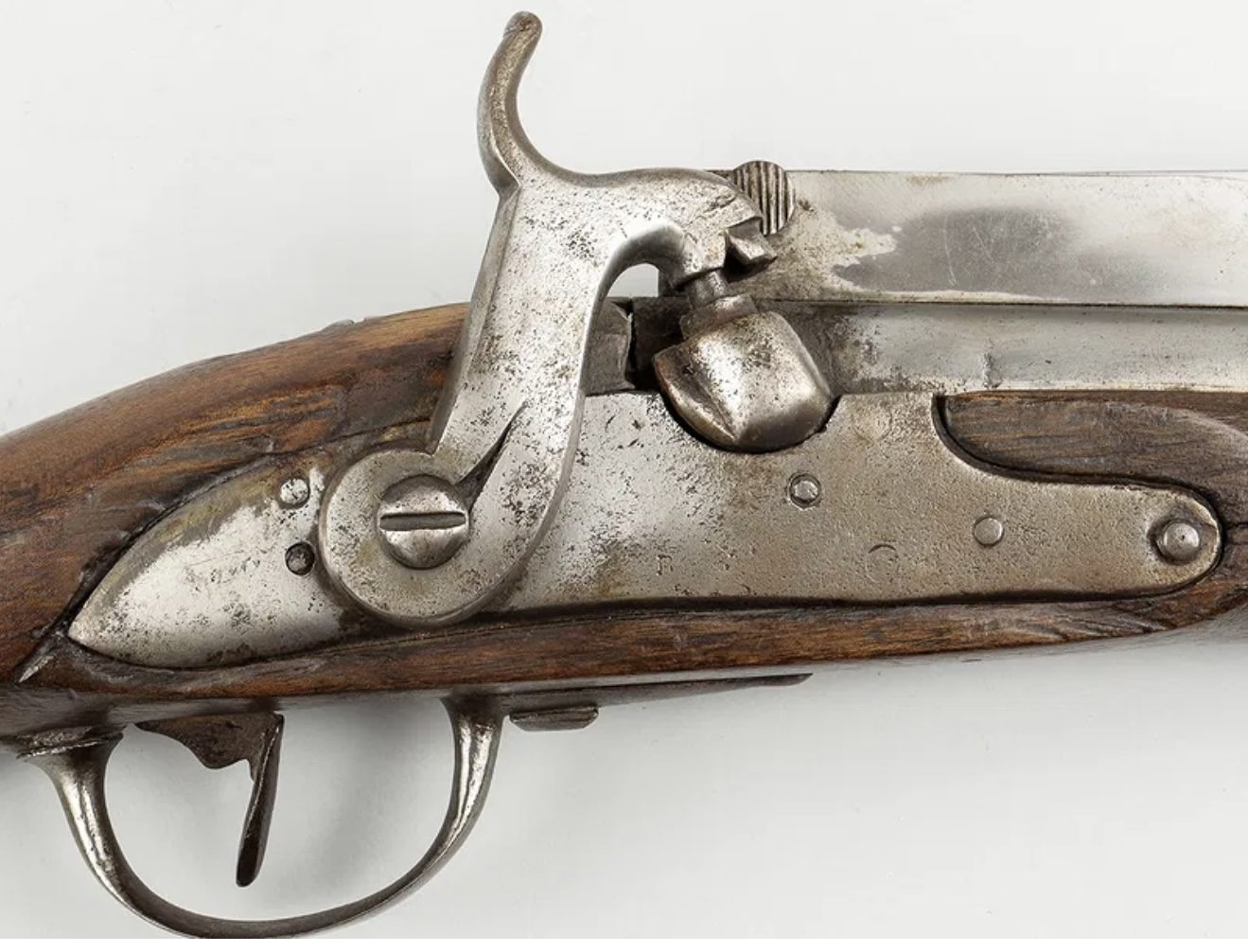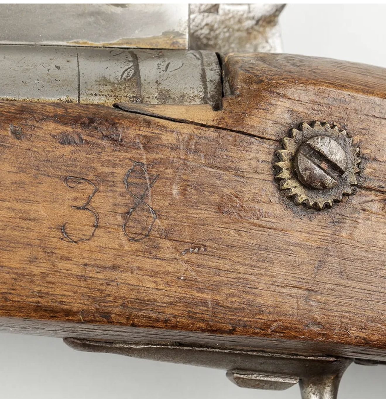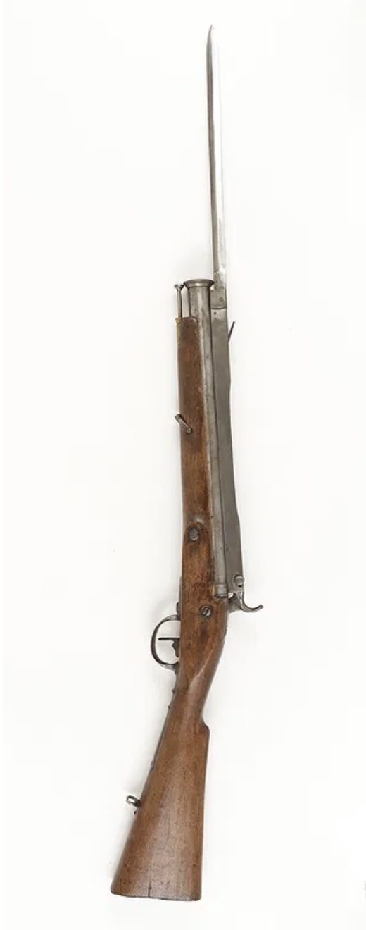 Civil War Blunderbuss with a spring-loaded bayonet. Has a brass cap box on the right side of stock. Number 38 carved on the upper left side of stock. It is in good condition and works well. $7995