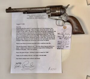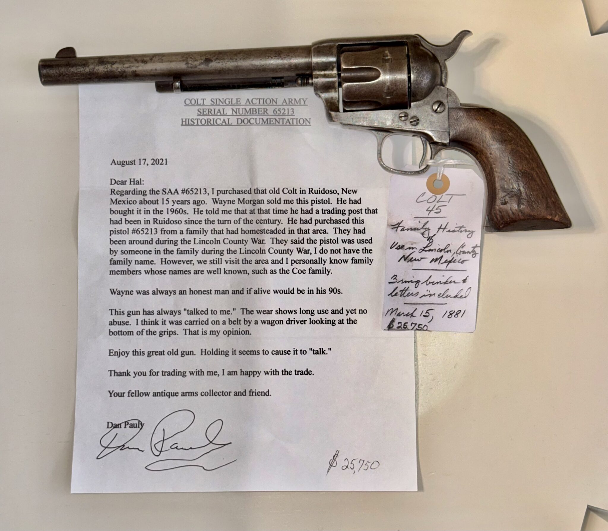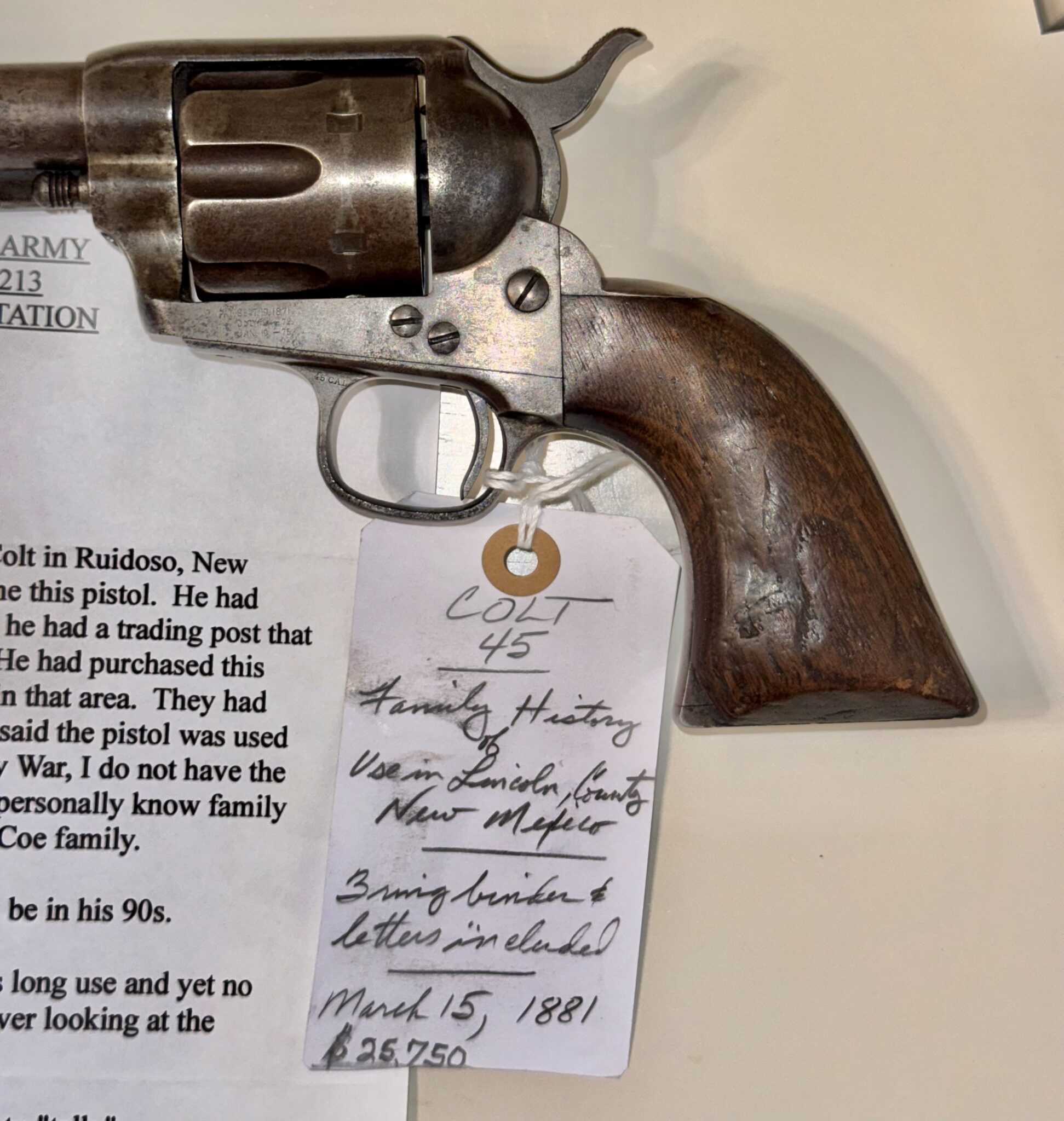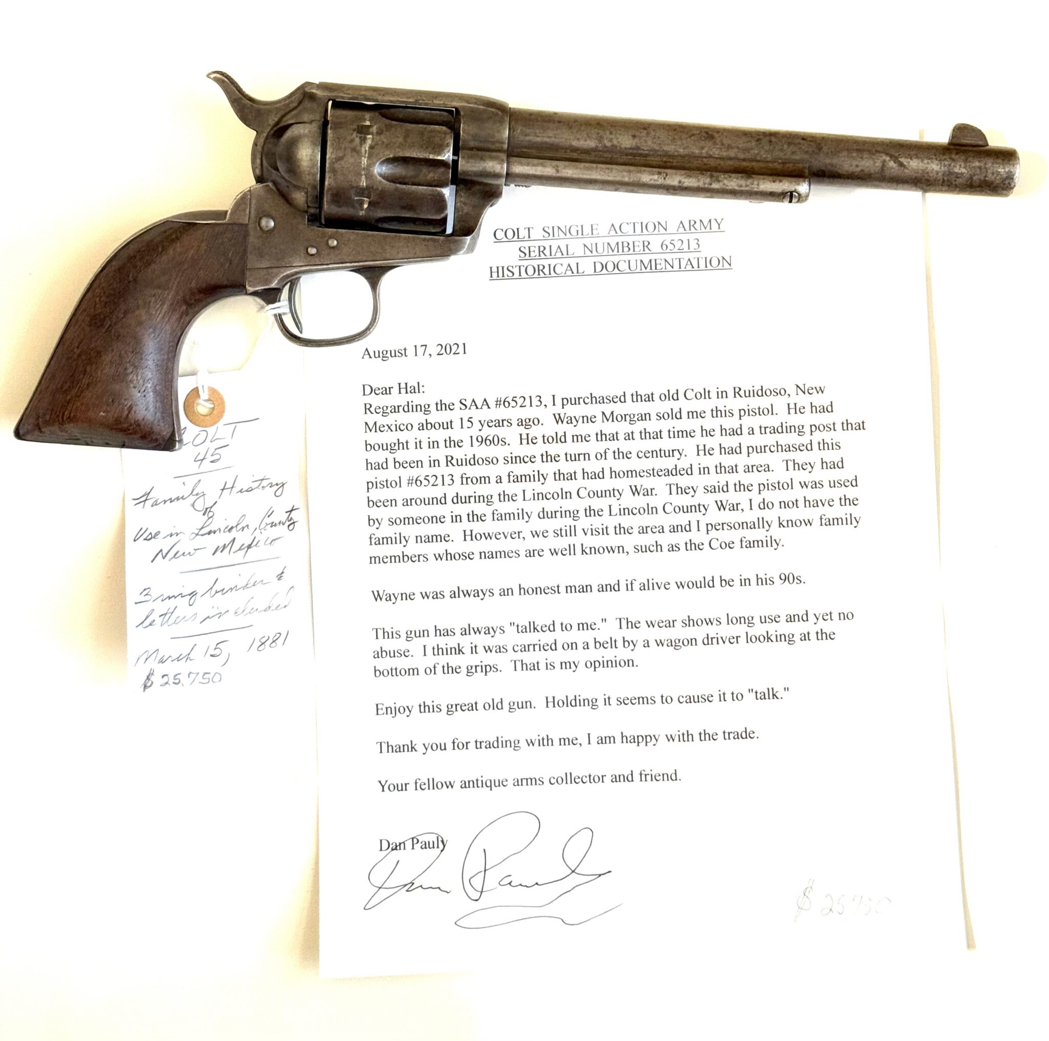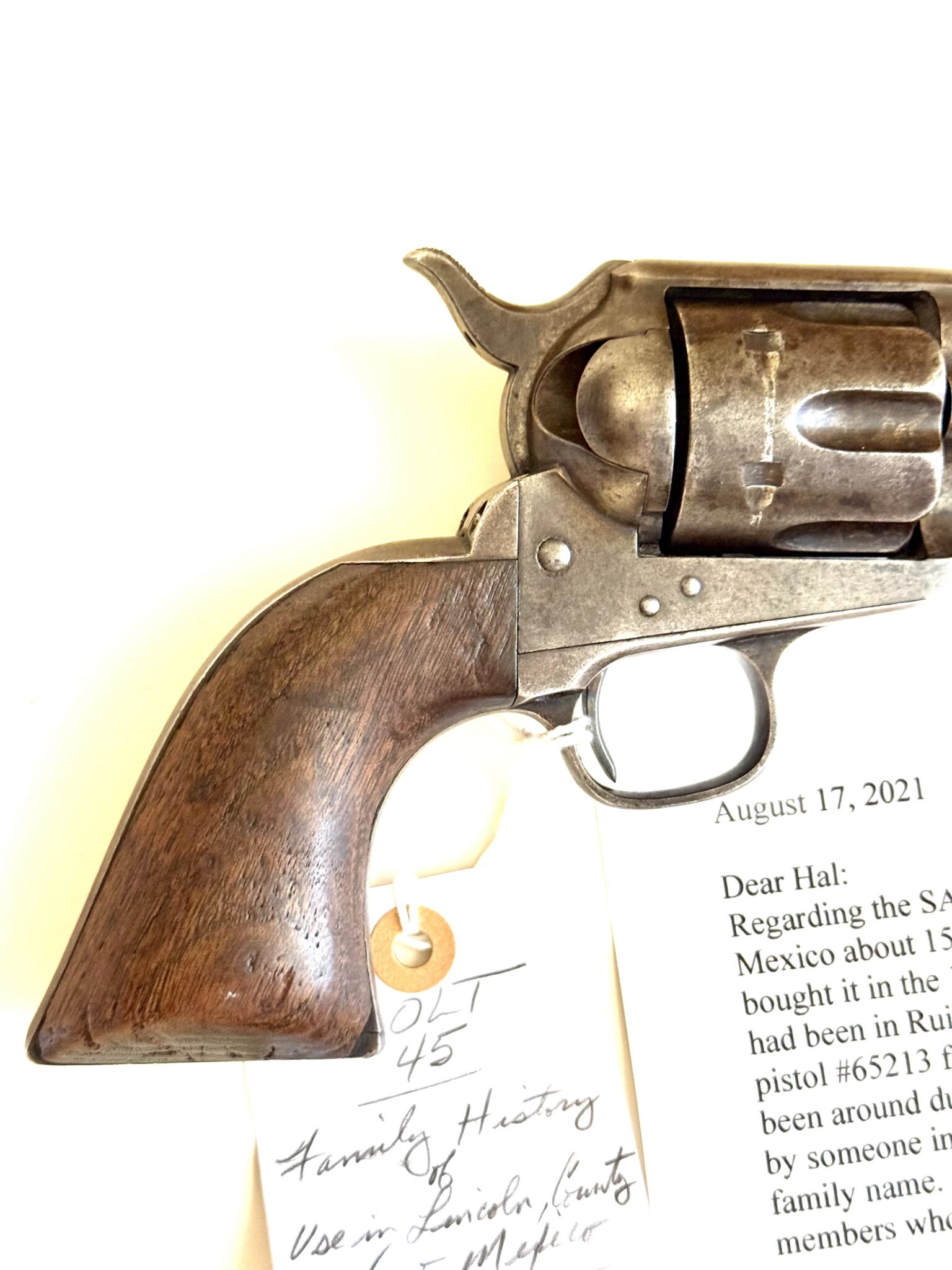Historical Colt single action 45 caliber revolver. Family documentation of the Colt verifies it was used during the Lincoln County Wars. Serial number 65213. Colt is in great condition and is mechanically fine. A Colt revolver that was used and carried in one of the most famous wars that ”Billy the Kid” was associated with.