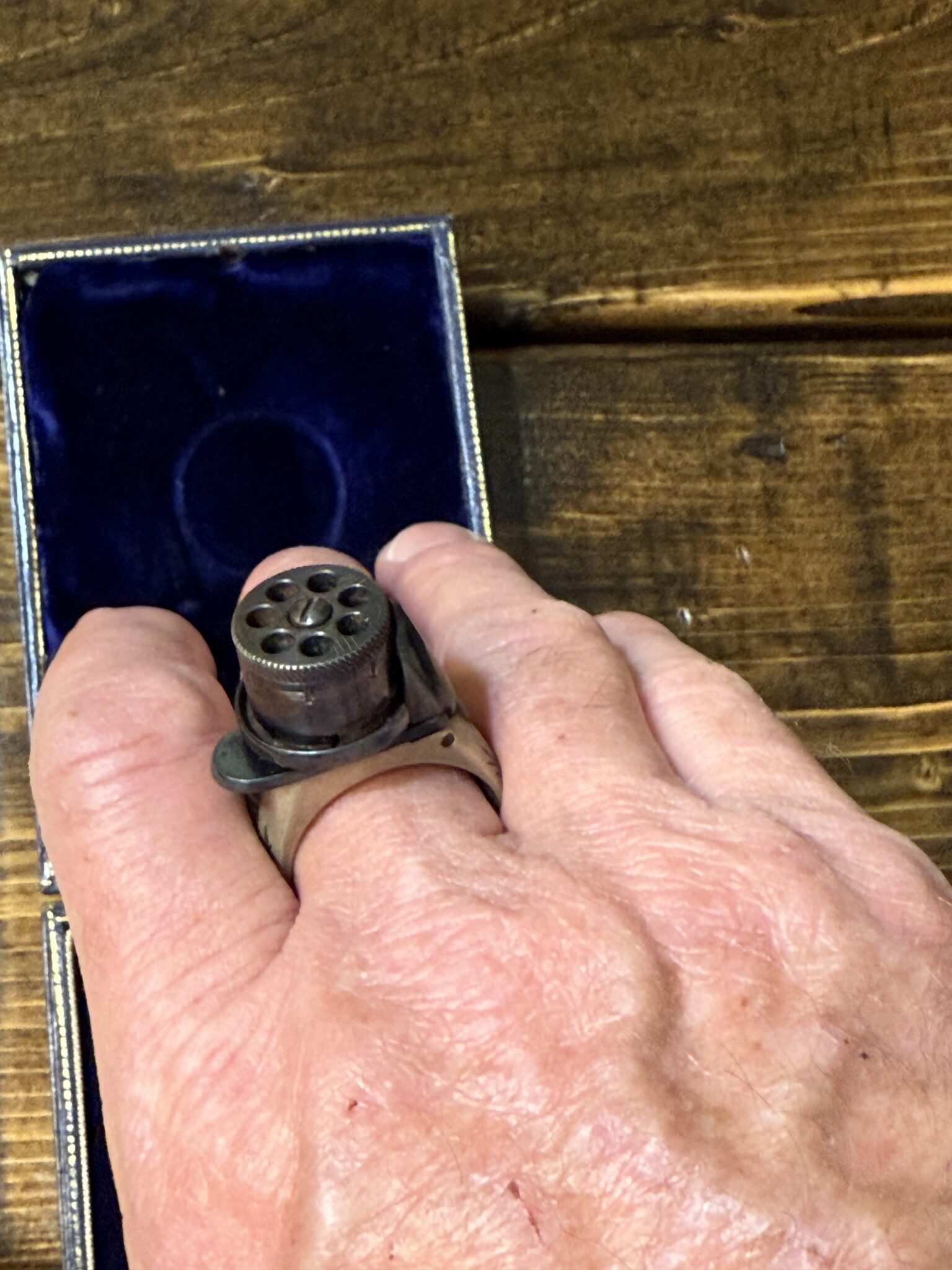 Rare ring revolver housed in its original box with tool and ammo. Imperial Protector spelled out on the outside of ring. Very unique and rare gun. $13k
