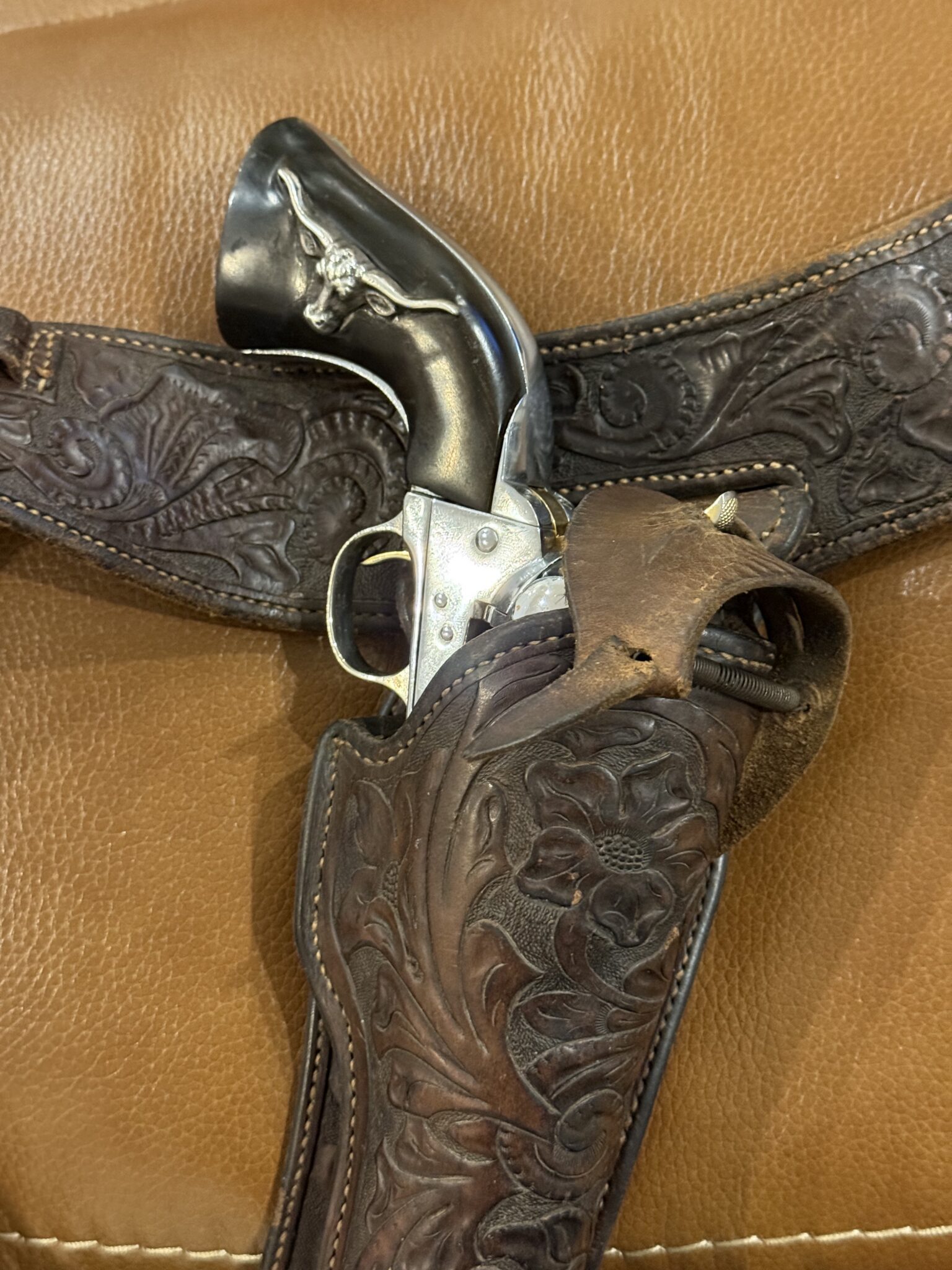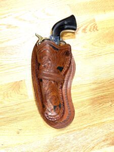 Antique floral tooled holster for a Colt SA 7 1/2” barrel. $695