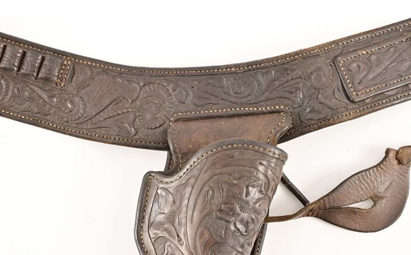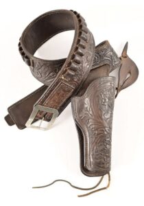 Rare gun rig fits 5 1/2” barrel Colt Single Action Revolvers. Muckelroy was the grandson of George Lawrence of Portland Oregon. $2350
