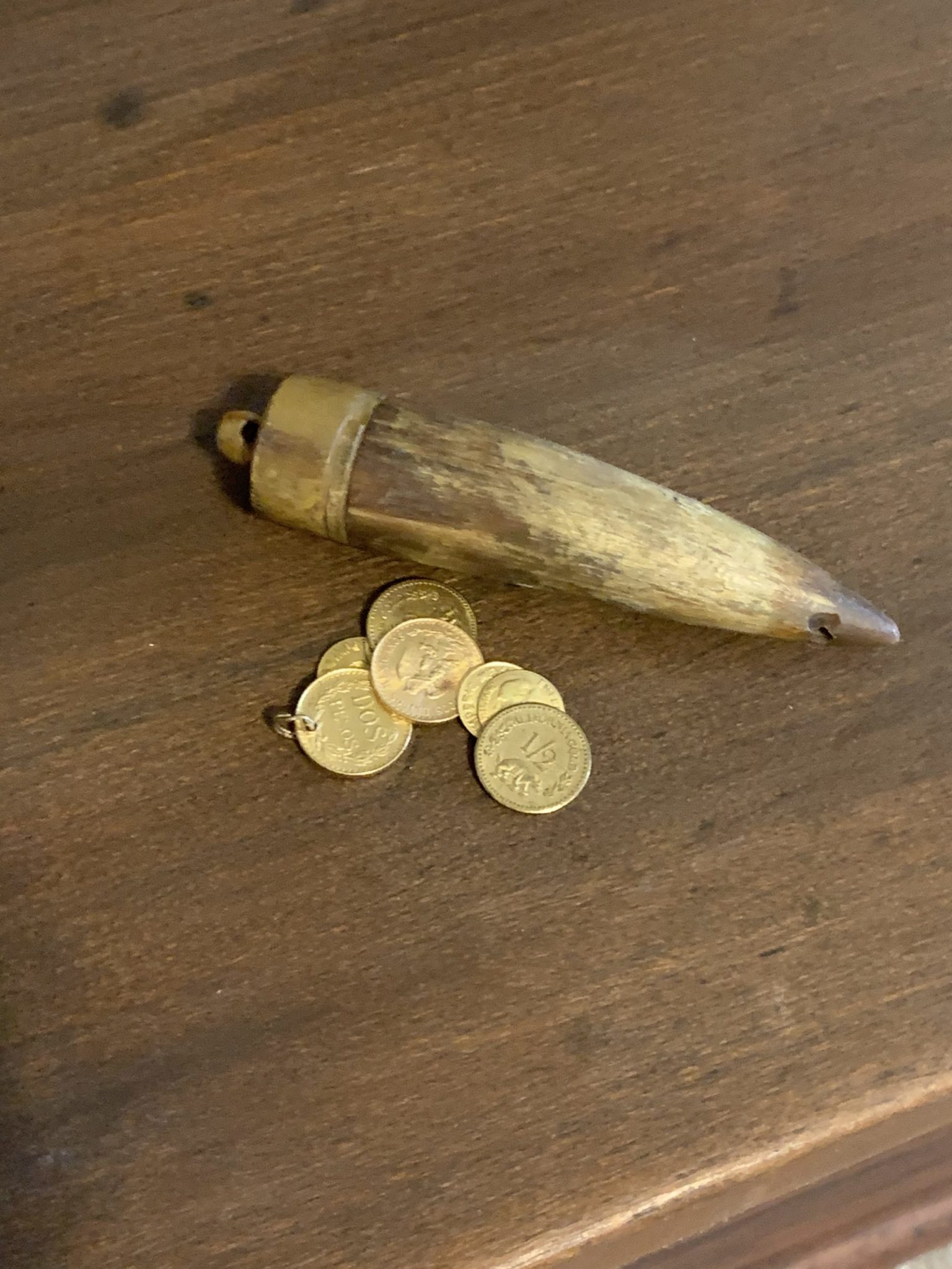 Rare Misc Items Page 4 Rare Misc Antiques Page 4. LAYAWAY AVAILABLE 1800’s INIDAN BEADED & QUILLED GUN HOLSTER. Most rare Indian beaded & quilled holster. Fits 1850 Colt Navy or 1860 Colt Army revolver. Gun is a separate item. $4550 SMALL POWDER HORN GOLD COINS. Small 3-inch powder horn to hide 8 gold coins inside. $1795 MILLER BROTHERS 101 RANCH BLISS, OKLAHOMA TERRITORY TRUNK. 101 ranch wood trunk with Ostrich lining inside of trunk. Measures 26” x 11” wide. $1850 LEMAT PROP GUN CONFEDERATE REVOLVER CIVIL WAR. Non-firing Lemat prop gun for display. Sold FLINTLOCK PISTOL NON-FIRING. For display flintlock prop pistol non-firing. $225 ANTIQUE BRONZE HAND. Old bronze hand holding coin. Measures 3-1/2” tall. $295 ANTIQUE MARTHA WASHINGTON PLAQUE. Old plaque of Martha Washington wife of George Washington first president of the United States. $595 IMPORTANT MEN PHOTOGRAPHS. Important men of the 1800’s photographs. P.O.R MAJOR A.B. ADVERSIS ENGRAVED BUTLER TRAY. Old silent butler tray with engraving Major A.B. Adverse on top of lid. $85 ANTIQUE MINERS LANTERN. Antique brass Miner’s lantern marked 69 g on handle. Lighting with whale blubber. $795 OLD GAL-LEG COWBOY SPURS. Old set of spurs in the shape of a Gal-Leg. Silver mounting on both sides of spurs. $295 ANTIQUE GAL-LEG NUTCRACKER. Old gal-leg nutcracker in good condition. $125 1920’S ROOTBEER COLOR FISH BOTTLE. 1920’S Root beer color fish bottle with original tag on side of bottle. In very nice condition. $295