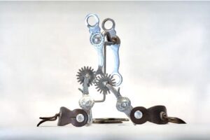 Large set of spurs by Bohlin of Hollywood California. Exquisite silver inlaid spurs with Bird head shanks. Probably made for a cowboy in the old-time western movies. $7950