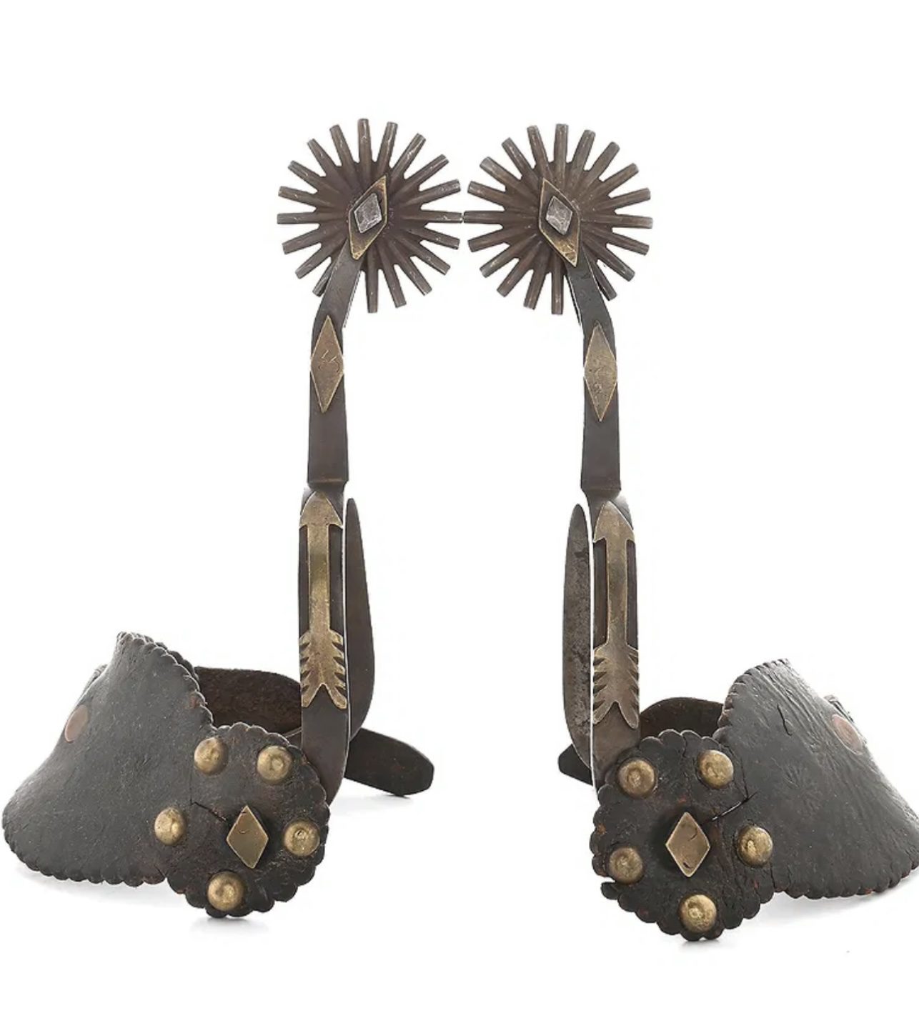 Large set of early California spurs. They are iron with double mounted inlaid silver in a barber pole strip style. Spurs also have a large Rowel measuring 3” diameter. These are even mounted on the top of the shank. Spurs are in great condition. $1195