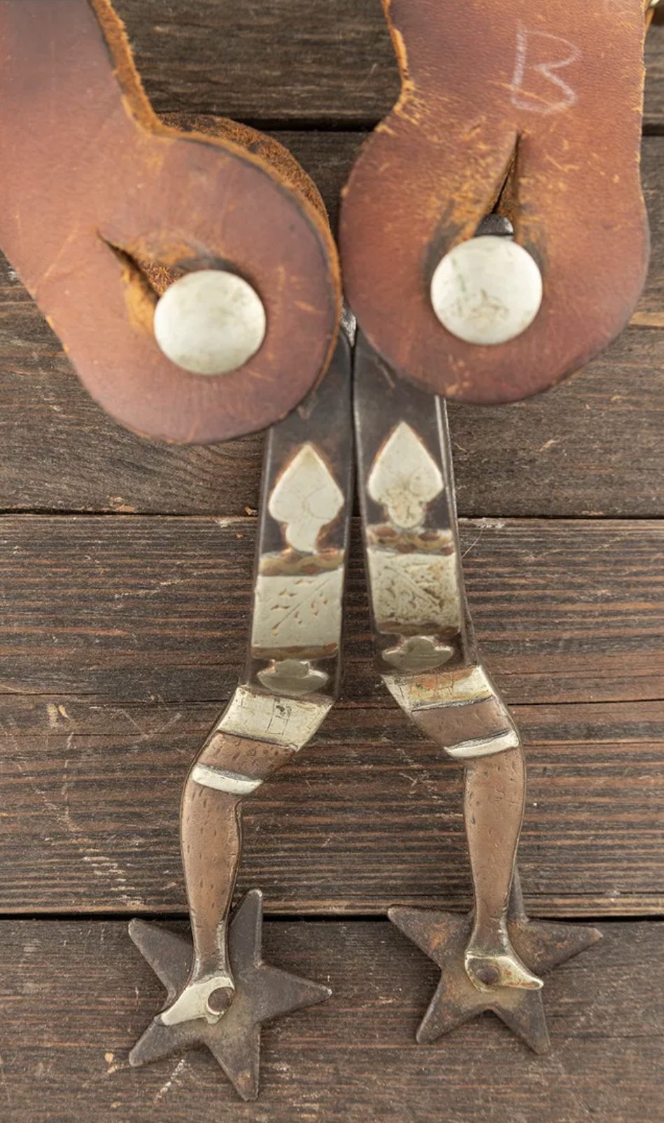 Early silver inlaid Wyoming spurs with original straps. On the other side of shanks engraved iron. Great pair of spurs. $4550