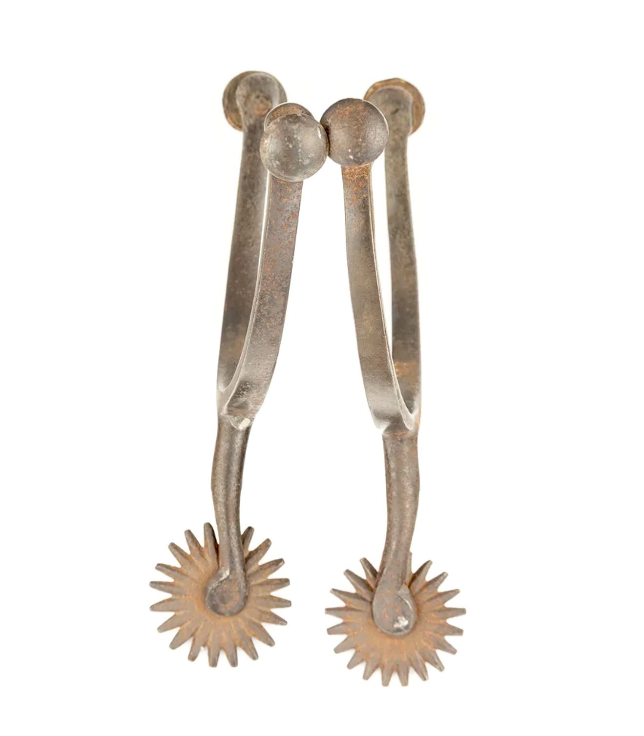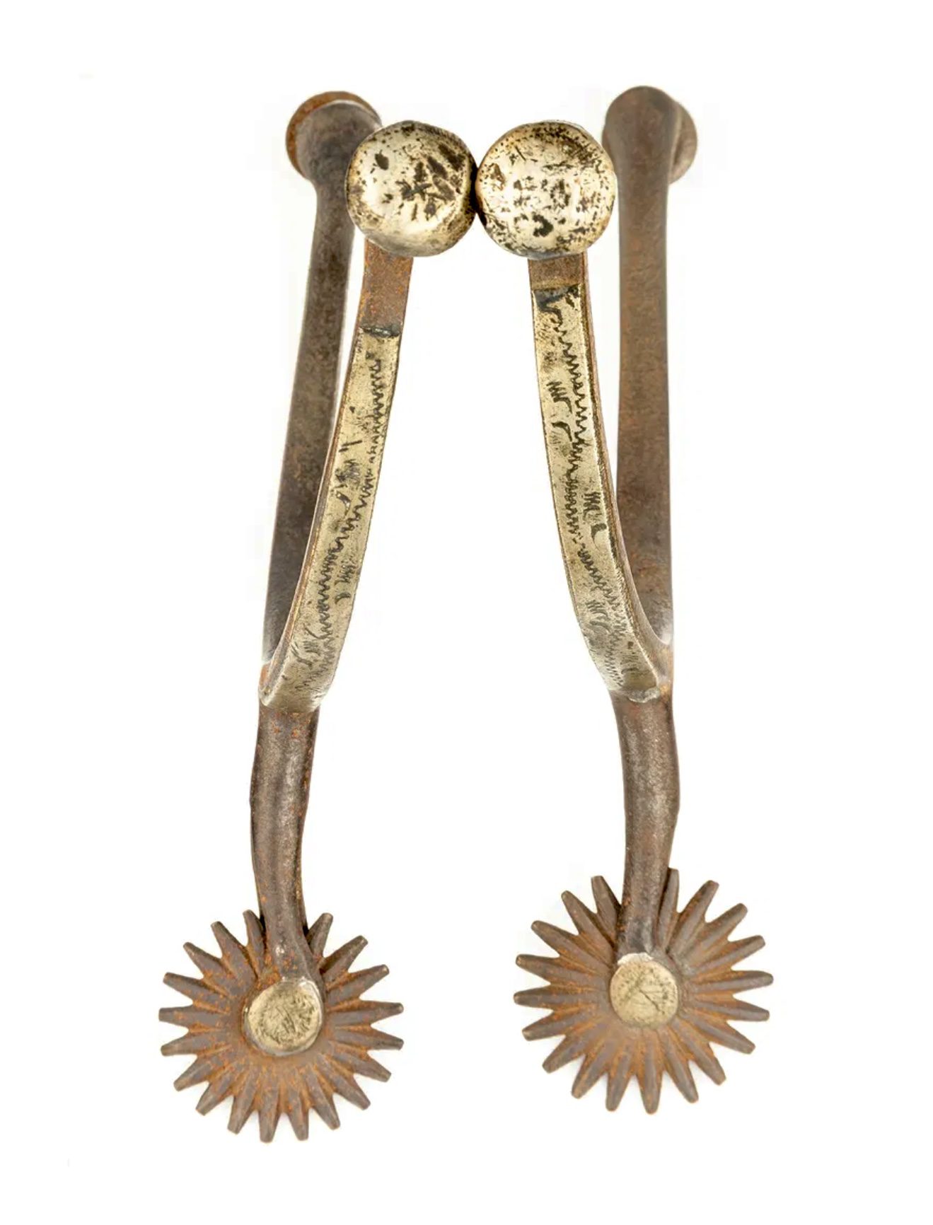 Rare McChesney spurs silver mounted. Made from pitchfork spikes. One of the scarcer patterns McChesney made. Really rare having silver mounting. Mostly seen without mounting. $2495