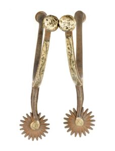 Old set of spurs with large buttons. Original straps but are not in good shape. Spurs are in great condition with decorations. $375